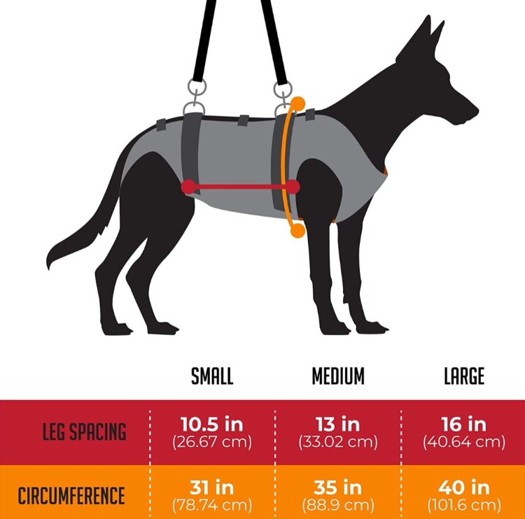 The Rock ‘N Rescue Dog Lift Harness weighs in at 30 ounces (850.486 grams).